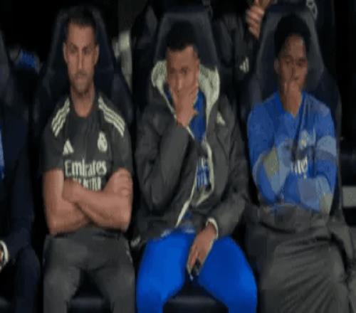 比赛继续进行,镜头给到姆巴佩。因伤没有首发的法国前锋坐在替补席上。