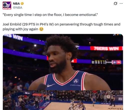 赛后恩比德感慨道:“每次踏上球场,我都感慨万千激动不已,因为过去几年对我,对我的家人来说都非常艰难,现在终于稳定下来了。”